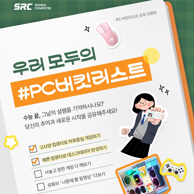 컴퓨터 관련 주요 부품 수입 유통 전문 업체 서린씨앤아이(대표: 전덕규 www.seorincni.co.kr)가 서린컴퓨터 공식 인스타그램(@seorin_com)을 통해 사용자 생성 콘텐츠 캠페인 우리 모두의 #PC버킷리스트를 진행한다. 이번 캠페인은 수험생과 일반 소비자의 PC 관련 추억과 새 출발을 기록 및 공유하는 것을 취지로 하며 2025년 11월 13일부터 2025년 11월 26일까지 운영된다.