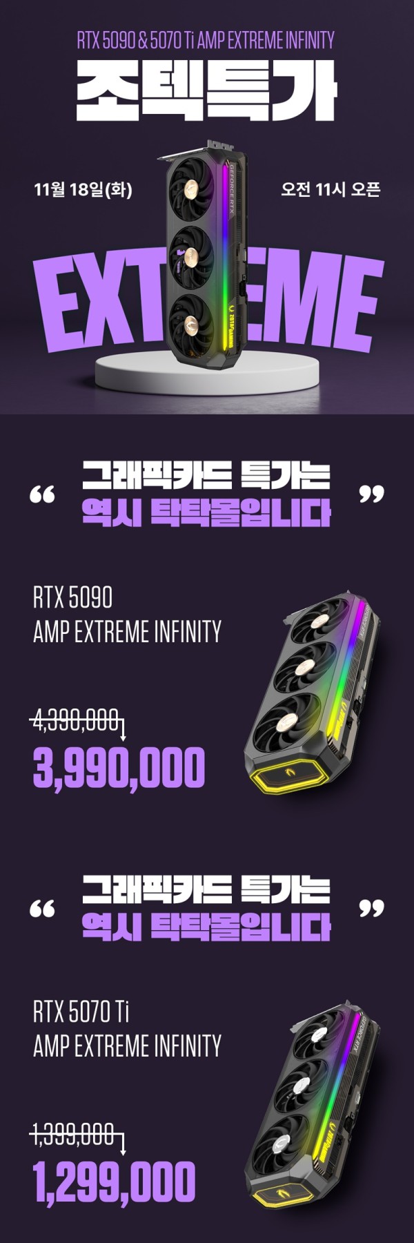 ‘ZOTAC GAMING GeForce RTX 5090 AMP Extreme Infinity’는 3,990,000원에, ‘ZOTAC GAMING GeForce RTX 5070 Ti AMP Extreme Infinity’는 1,299,000원에 만나볼 수 있다.