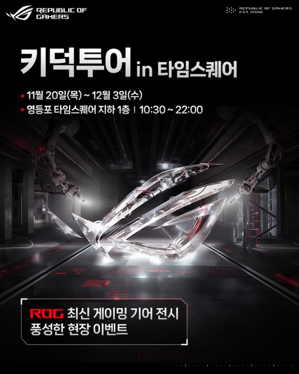 키덕투어 in 영등포는 11월 20일(목)부터 12월 3일(수)까지 영등포 타임스퀘어 B1 뉴웨이브에서 진행된다. 현장에서는 ROG의 최신 스플릿 게이밍 키보드인 ROG FALCATA 및 무선 8,000Hz 폴링레이트를 지원하는 초경량 게이밍 마우스 HARPE 2 ACE 등 다양한 제품들이 전시되어 게이머 및 키보드 매니아가 직접 제품을 만져보고 체험해보면서 뛰어난 완성도를 직접 확인할 수 있다.