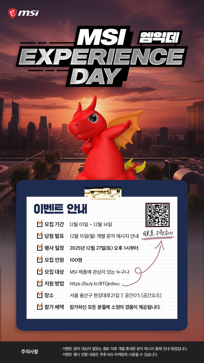 ㈜엠에스아이코리아(https://kr.msi.com, 대표 공번서)는 오는 12월 27일(토), 서울 용산구에 위치한 공간 O’S[공간오즈]에서 ‘MSI 익스피리언스 데이(MSI Experience Day)’를 개최하고, 오프라인 체험 행사에 참여할 참가자 100명을 모집한다고 밝혔다.