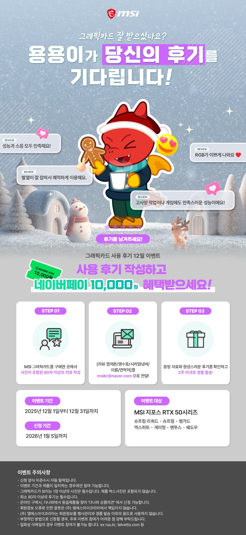 이번 이벤트는 그래픽카드를 구매하고 후기를 작성한 고객에게 네이버페이 포인트 10,000원권을 증정하는 형태로 진행된다. MSI 지포스 RTX 50 시리즈를 2025년 12월 1일부터 12월 31일까지 구매한 고객이라면 누구나 참여할 수 있으며, 이벤트 신청은 2026년 1월 5일까지 가능하다.