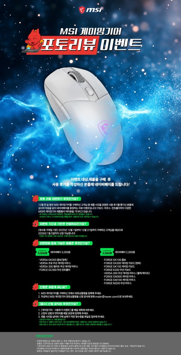 ㈜엠에스아이코리아(https://kr.msi.com, 대표 공번서)는 MSI 인기 게이밍기어 구매 고객을 대상으로 12월 한 달간 사용 후기 이벤트를 진행한다고 밝혔다. 참여 고객에게는 제품별 2,000원~3,000원 상당의 네이버페이 포인트가 선착순으로 지급된다.
