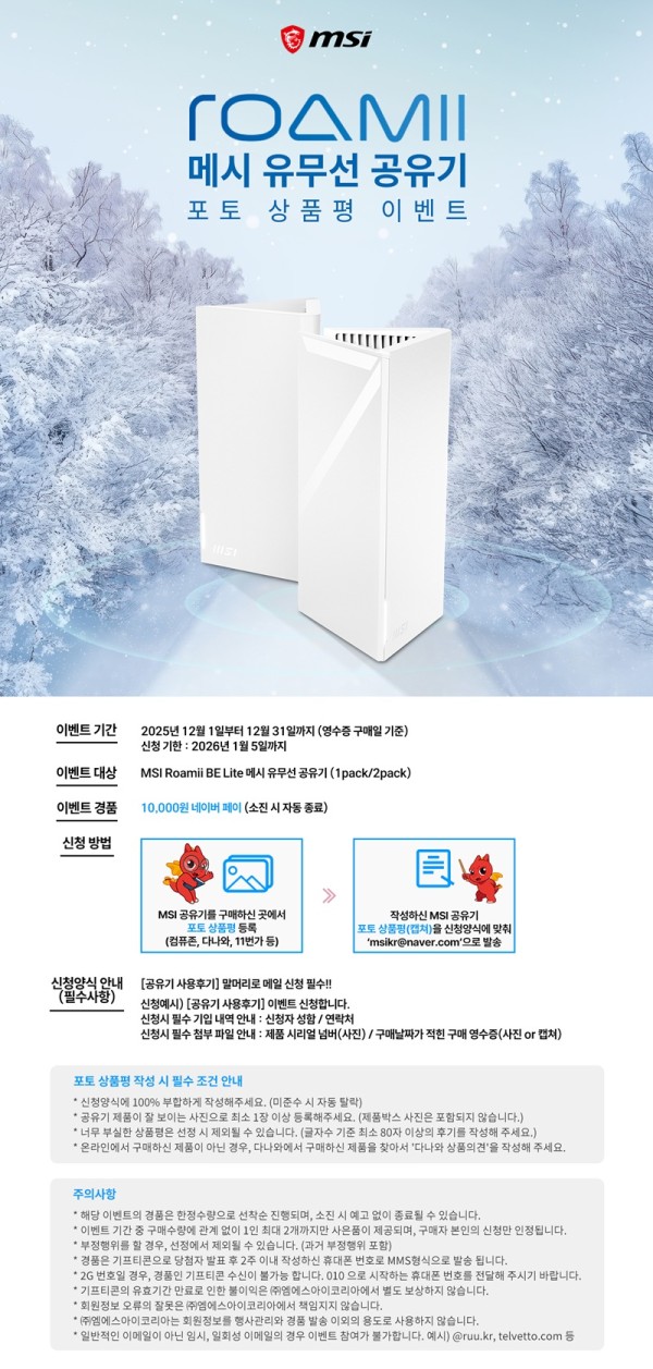 MSI Roamii BE Lite WiFi7 메시 유무선 공유기를 2025년 12월 1일부터 12월 31일까지 구매하고 사용 후기를 작성한 고객이라면 누구나 참여 가능하다. 기간 내 구매자들은 2026년 1월 5일까지 이벤트를 신청할 수 있다.