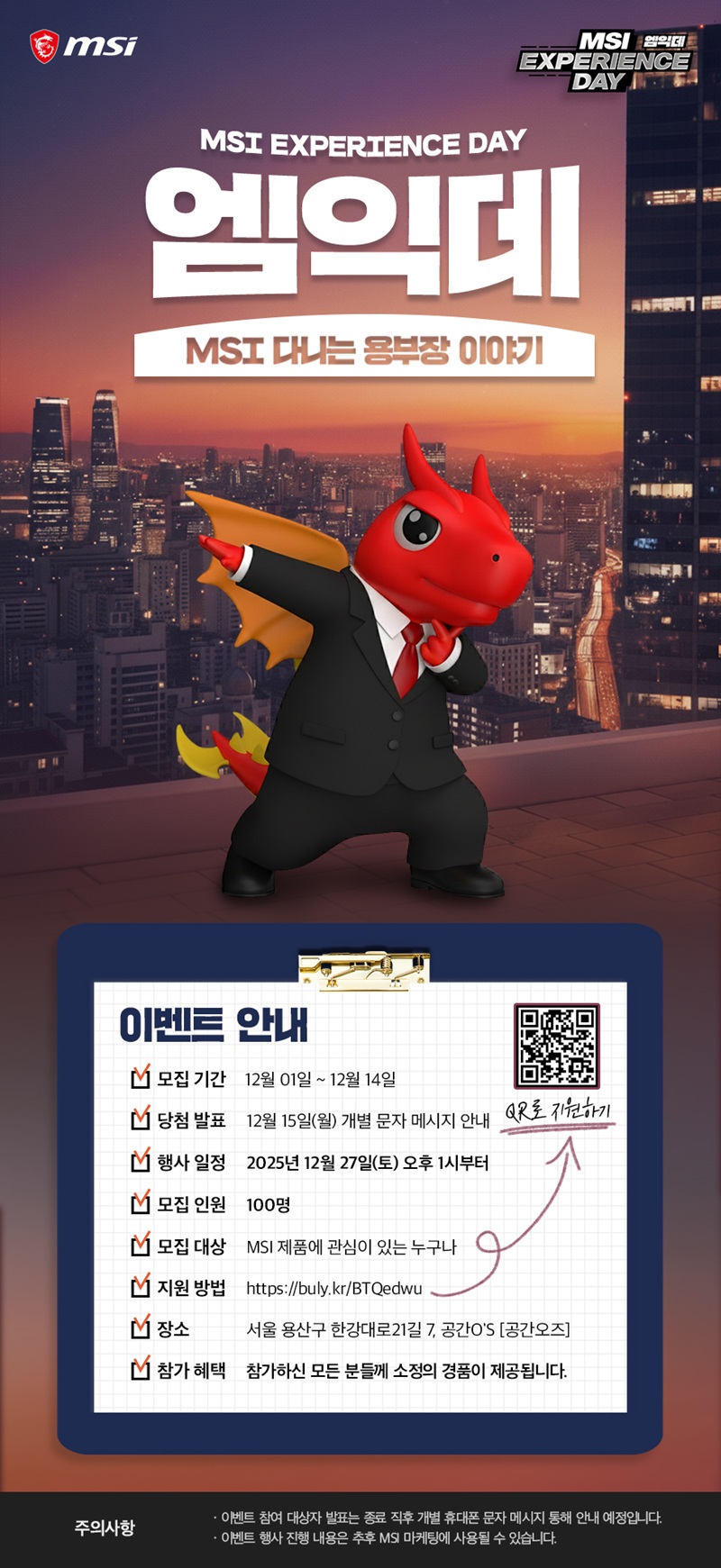 ㈜엠에스아이코리아(https://kr.msi.com, 대표 공번서)는 오는 12월 27일(토), 서울 용산구에 위치한 공간 O’S[공간오즈]에서 ‘MSI 익스피리언스 데이(MSI Experience Day)’를 개최하고, 오프라인 체험 행사에 참여할 참가자 100명을 모집한다고 밝혔다.