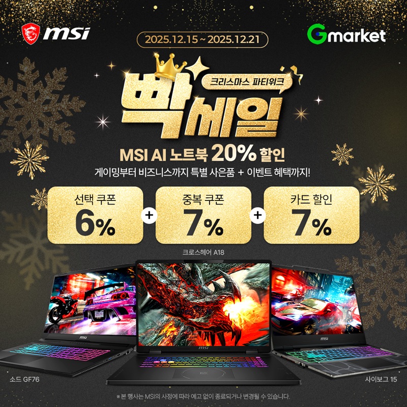 ㈜엠에스아이코리아(https://kr.msi.com, 대표 공번서)는 연말 쇼핑 시즌을 맞아 12월 15일부터 21일까지 G마켓에서 진행되는 빡세일에 참여해 최신 고성능 노트북 할인 기획전을 진행한다고 밝혔다.