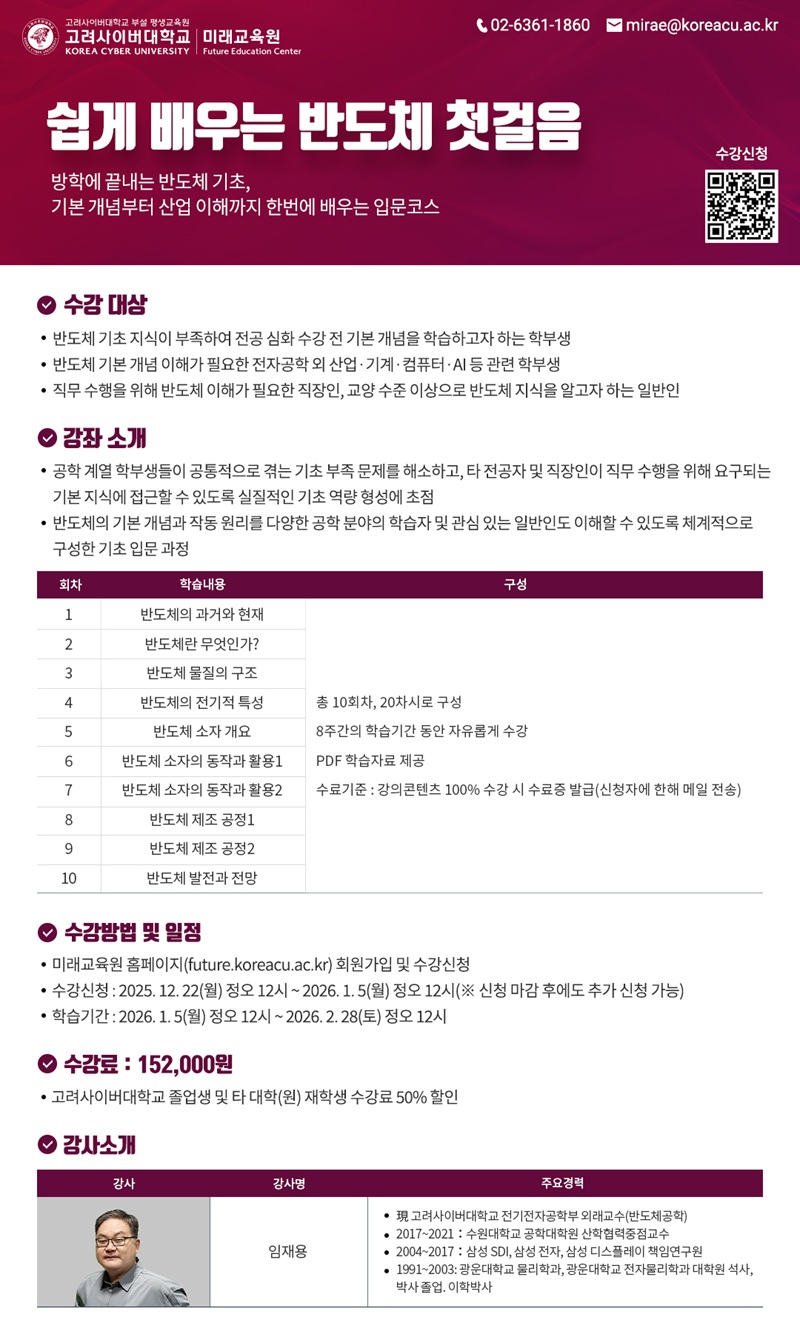 강의는 고려사이버대학교 전기전자공학부 외래교수인 임재용 교수가 맡는다. 임 교수는 삼성SDI와 삼성전자, 삼성디스플레이 등에서 연구 경력을 쌓았으며, 수원대학교 공학대학원 산학협력중점교수를 역임하는 등 산업과 학계를 두루 경험한 반도체 전문가다.