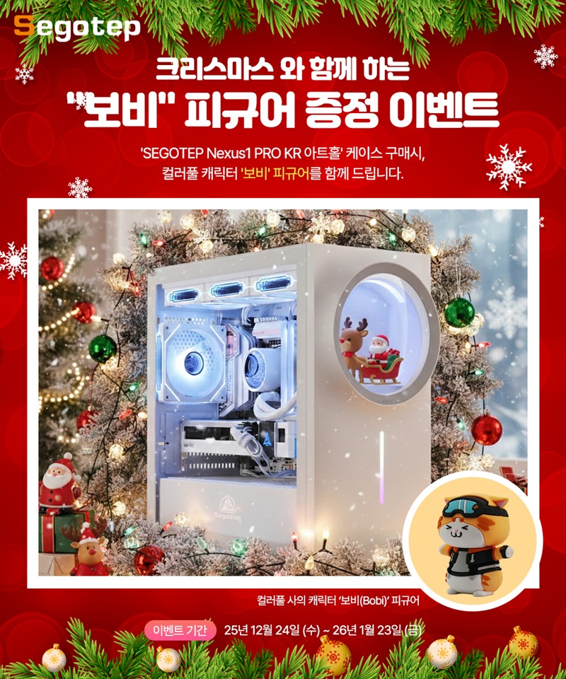 많은 국내 소비자의 요청에 의한 ‘보비 피규어’를 2025년12월24일 크리스마스이브 부터 ‘보비 피규어’ 1:1 로 증정하는 이벤트를 진행한다. Nexus1 PRO KR 아트홀은 M-ATX 및 ITX 메인보드 규격을 지원하는 케이스다. 최대 385mm 길이의 그래픽카드와 최대 165mm 높이의 공랭 CPU 쿨러와 200mm 길이의 파워서플라이 를 장착할 수 있어, 다양한 시스템 구성이 가능하다.