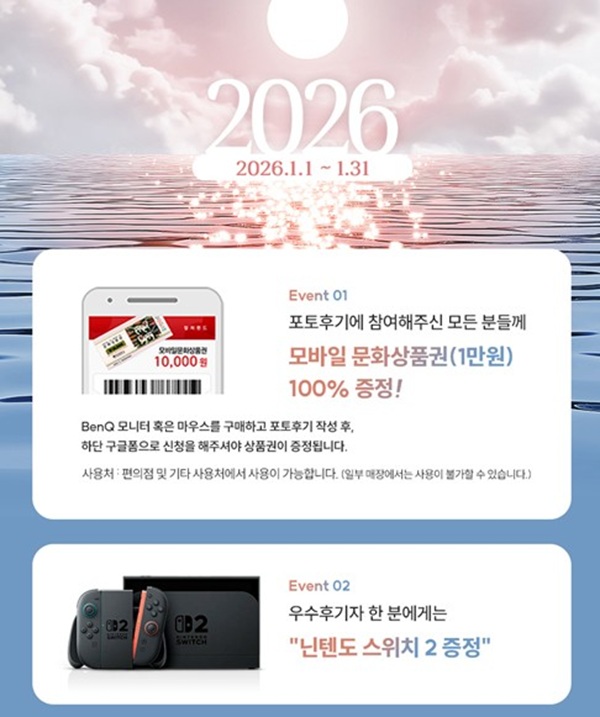 병오년 새해를 맞이하여 진행하는 이번 이벤트는 1월 한 달 간 벤큐 모니터 또는 마우스를 구입하고 포토후기를 작성한 뒤, 구글폼으로 신청한 모든 분들에게 모바일 문화상품권(1만원권)을 증정하고, 우수 후기자 1명에게는 ‘닌텐도 스위치 2’를 추가로 증정하는 행사이다.
