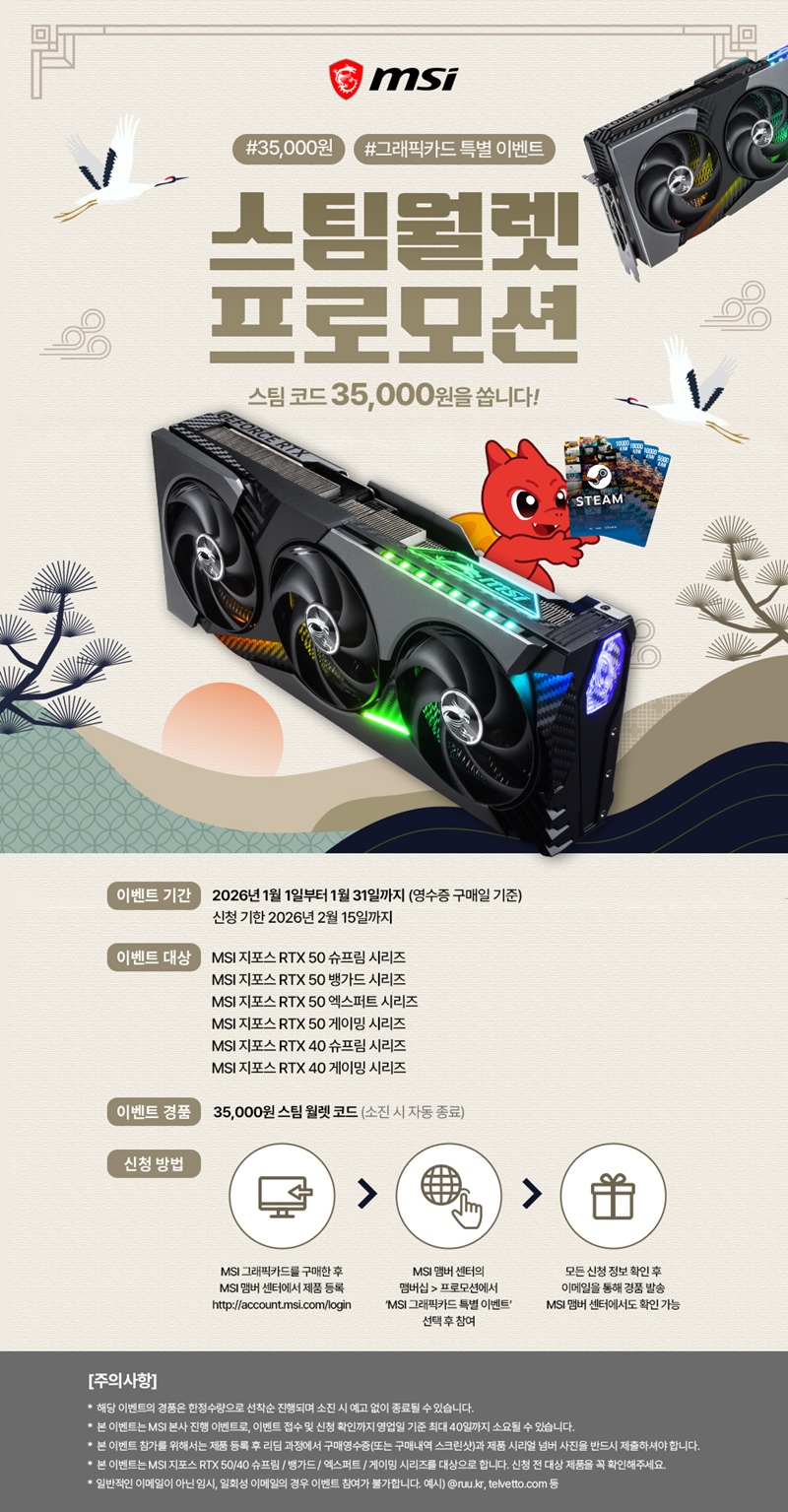 ㈜엠에스아이코리아(https://kr.msi.com, 대표 공번서)는 새해를 맞아 MSI 지포스 그래픽카드 구매 고객을 대상으로 35,000원 상당의 스팀(STEAM) 월렛 코드를 증정하는 프로모션을 진행한다고 밝혔다.