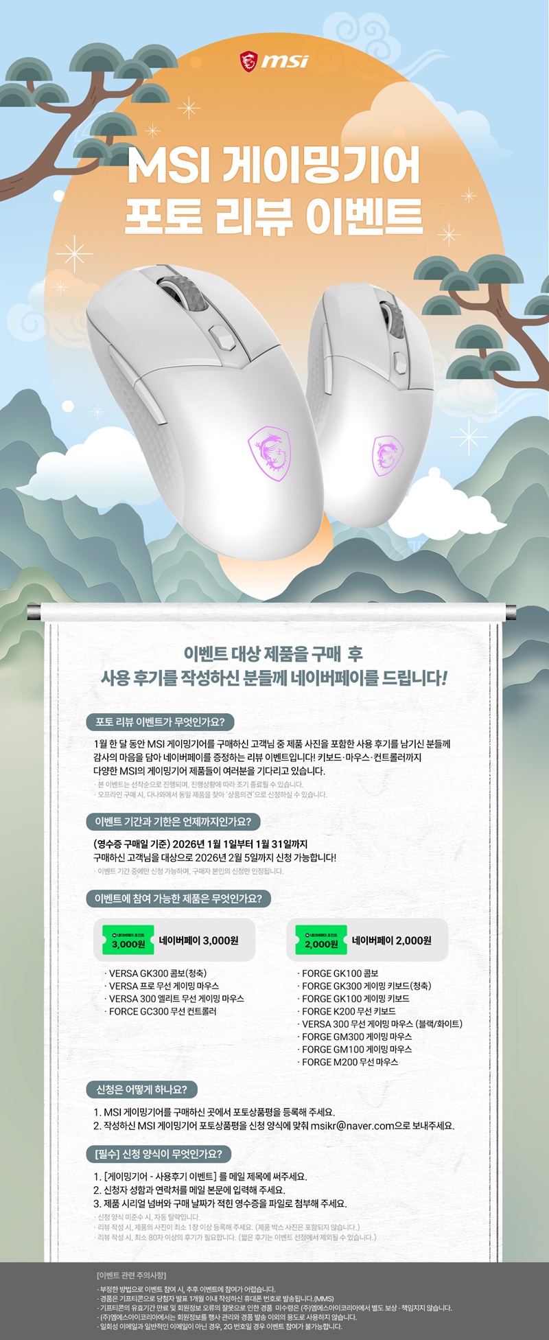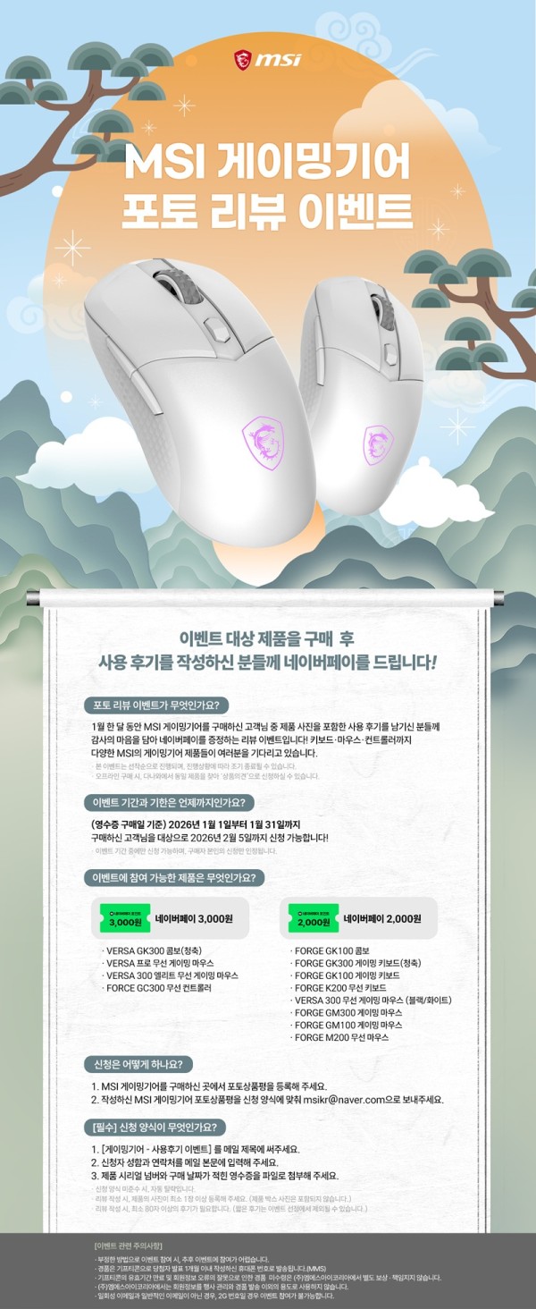이번 이벤트는 2026년 1월 1일부터 1월 31일까지 MSI 게이밍기어 주요 제품을 구매한 고객을 대상으로 진행되며, 제품에 따라 2,000원 또는 3,000원 상당의 네이버페이 포인트가 선착순으로 지급된다. 경품은 한정 수량으로 준비되어 있으며, 소진 시 이벤트는 자동 종료된다.