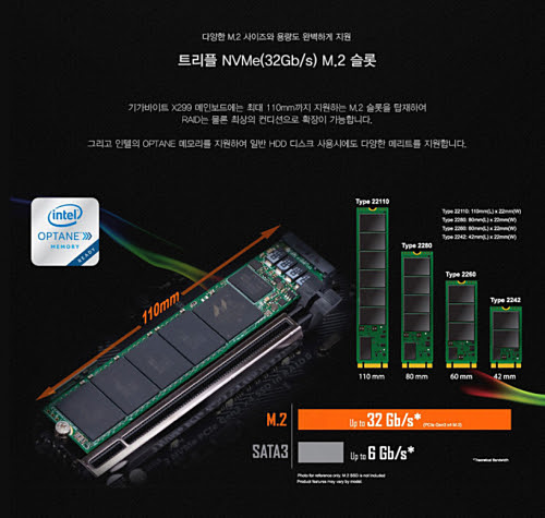 또한 부품간의 공간 제약은 최소화 시키고 뛰어난 전송 속도 (최대 32Gb/s)를 지원하는 NVMe M.2 슬롯을 최대 3개까지 탑재하여 RAID까지 가능하고, X299 AORUS Gaming 9와 X299 AORUS Gaming 7 메인보드는 트리플 NVMe에 써멀 가드를 기본 번들 제공하여 튜닝 효과는 물론 발열로 인한 성능 저하 방지는 물론 시스템 안정성에도 큰 메리트를 제공한다.