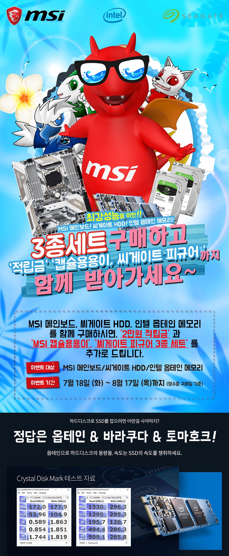 이번 행사는 7월 18일(화)부터 8월 17일(목)까지 컴퓨존에서 MSI 메인보드, 인텔 옵테인 메모리, 씨게이트 HDD를 함께 영수증 구매일을 기준으로 동시에 구매한 소비자를 대상으로 한다. 경품으로는 컴퓨존 내에서 현금처럼 활용할 수 있는 2만원 적립금, MSI 마스코트 캡슐용용이, 씨게이트 피규어 3종 세트가 제공되며, 8월 24일(월) 일괄 지급될 예정이다.