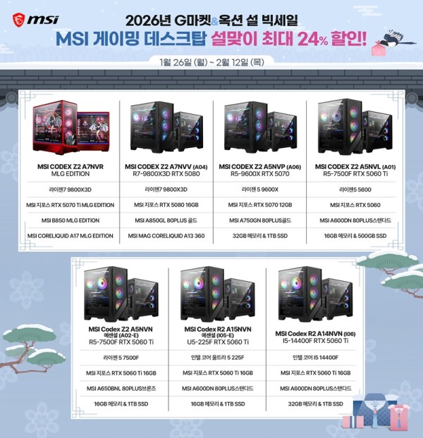 ㈜엠에스아이코리아(http://kr.msi.com, 대표 공번서)는 1월 26(월)부터 2월 12일(목)까지 진행되는 G마켓&옥션 ‘설 빅세일’을 통해, 강력한 성능의 게이밍 데스크탑 ‘Codex(코덱스)’ 시리즈를 상반기 최대 혜택가로 판매한다.
