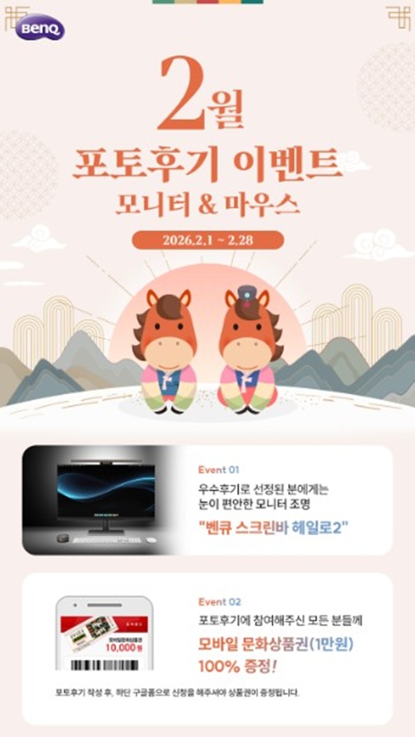 다가올 새학기를 맞이하여 진행하는 이번 이벤트는 2월 한 달 간 벤큐 모니터 또는 마우스를 구입하고 포토후기를 작성한 뒤, 구글폼으로 신청한 모든 분들에게 모바일 문화상품권(1만원권)을 증정하고, 우수 후기자 1명에게는 눈이 편안한 모니터 조명 ‘벤큐 스크린바 헤일로 2’를 추가로 증정하는 행사이다.