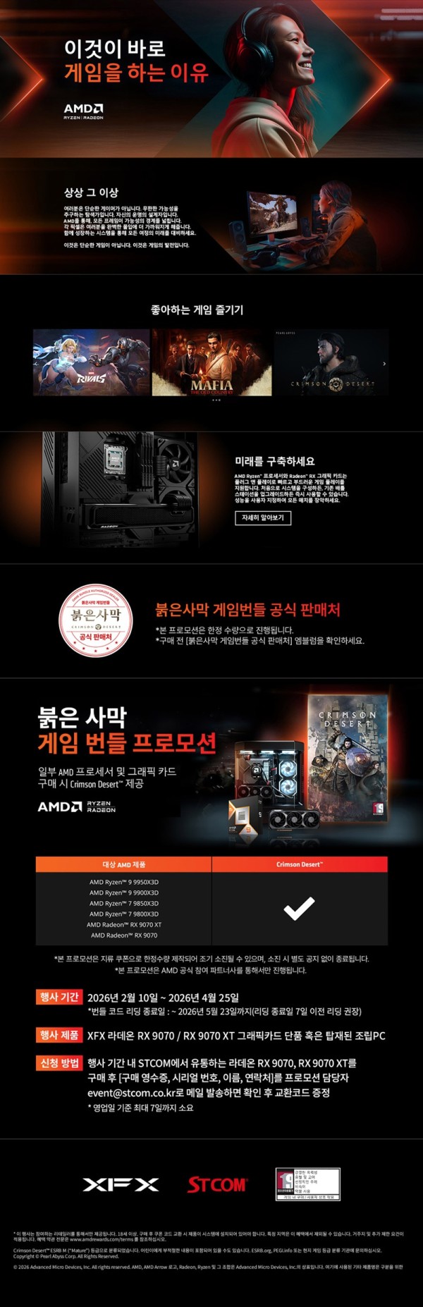 1998년 설립되어 20년 이상 컴퓨팅 관련 솔루션을 유통해온 전문 유통사인 (주)에스티컴퓨터 (대표:서희문, 이하 STCOM)는 XFX 라데온 RX 9070 시리즈 구매자를 대상으로 붉은 사막 번들 증정 행사를 진행한다.
