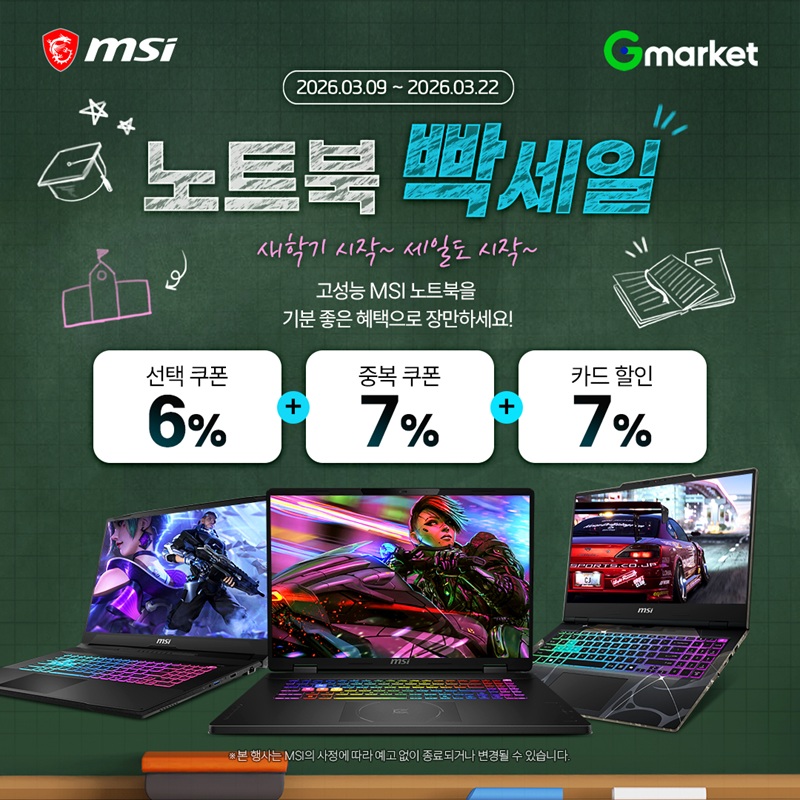 ㈜엠에스아이코리아(대표 공번서, https://kr.msi.com)는 3월 9일부터 22일까지 G마켓에서 진행되는 ‘빡세일’ 행사에 참여해 MSI 노트북 할인 프로모션을 진행한다고 밝혔다.