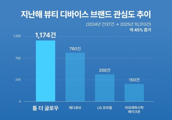 딥블루닷의 소셜 리스닝 및 리뷰 분석 솔루션 싱클리는 9일 지난해 뷰티 디바이스 주요 브랜드의 온라인 언급량(네이버 카페, 인스타그램, 유튜브 쇼츠, X 등에 게재된 포스팅 수)을 분석한 결과, 톰 더글로우가 총 1174건으로 가장 높은 관심도를 기록했다고 밝혔다. 뒤이어 APR 메디큐브 760건, LG전자 프라엘 268건, 아모레퍼시픽 메이크온 150건 순으로 나타났다.