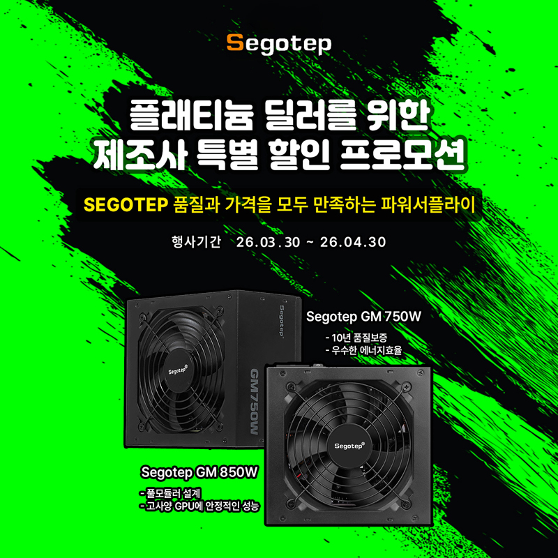 이번 프로모션은 품질과 가격 경쟁력을 동시에 갖춘 세고텝 GM 시리즈 파워서플라이를 플래티넘 딜러 전용 특가로 제공하기 위해 마련됐다. 행사 대상 제품은 ‘Segotep GM 80PLUS GOLD 풀모듈러 ATX 3.1 (PCIe 5.1) 블랙’ 모델로, 850W와 750W 파워서플라이 제품이 포함된다.