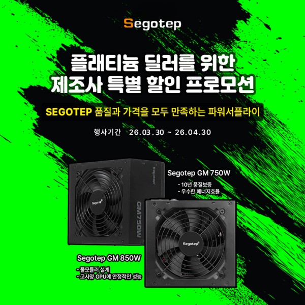 이번 세고텝 파워서플라이 할인 프로모션은 2026년 3월 30일부터 4월 30일까지 한 달간 진행되며, 컴퓨존 플래티넘 딜러 회원을 대상으로 한 전용 할인 행사로 운영된다.