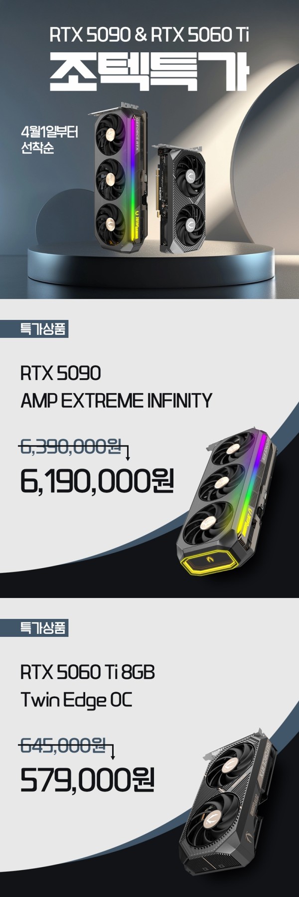 조텍, 조텍코리아, ZOTAC, ZOTAC Korea, 그래픽카드, 만우절, 특가!, 조텍 RTX 5090, 및, RTX 5060 Ti 8GB, 한정, 수량, 특가