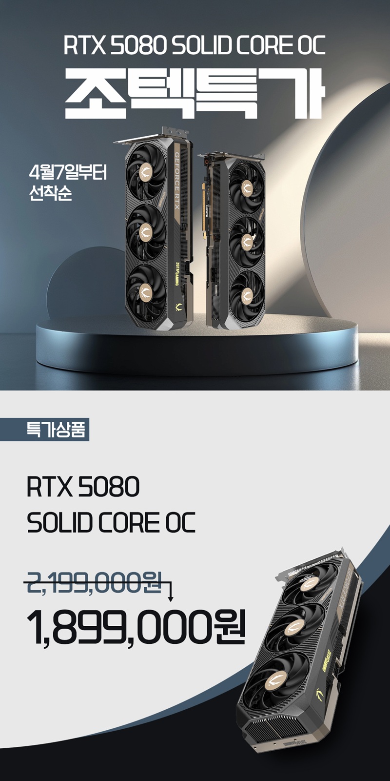 ‘조텍의 그래픽카드 특가는 조텍 공식 쇼핑몰 탁탁몰(www.tagtag.co.kr)에서 4월 7일부터 4월 9일 혹은 소진 시까지 진행된다. 본 특가에서는 ‘ZOTAC GAMING GeForce RTX 5080 Solid Core OC’를 1,899,000원에 만나볼 수 있다.