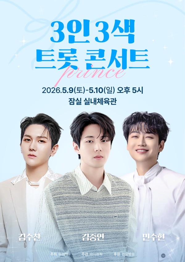 ‘3인 3색 트롯 콘서트’는 김수찬, 김중연, 민수현이 출연하는 공연으로, 오는 5월 9일과 10일 양일간 잠실 실내체육관에서 개최된다. 티켓은 현재 ‘마이원픽 쇼핑’을 통해 단독 판매 중이며, 향후 주요 예매처로 판매 채널을 확대할 예정이다.