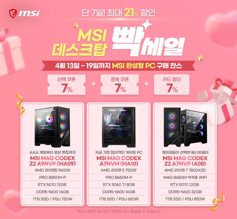 엠에스아이코리아(대표 공번서)는 4월 13일(월)부터 4월 19일(일)까지 일주일간, G마켓에서 진행하는 가전·디지털기기 대규모 할인 행사 ‘디지털 빡세일’에 참여해 인기 게이밍 데스크탑 ‘코덱스’ 시리즈를 최대 21% 할인된 가격에 선보인다고 밝혔다.