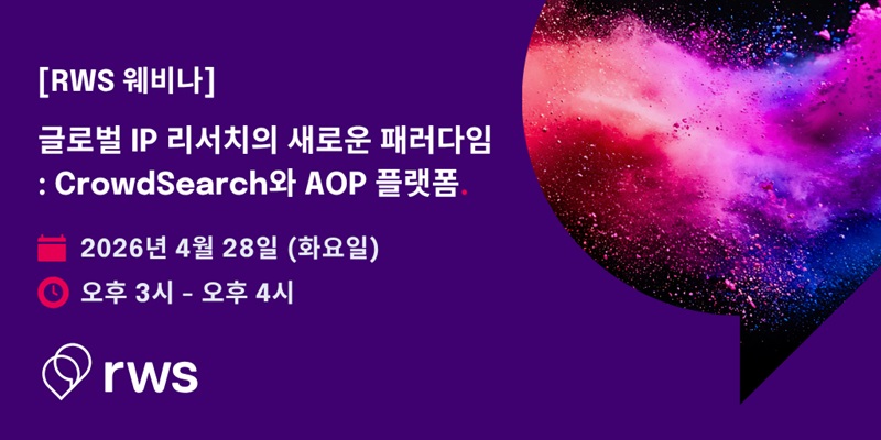글로벌 콘텐츠 및 IP 솔루션 기업 RWS 코리아는 오는 4월 28일 오후 3시 ‘글로벌 IP 리서치의 새로운 접근: CrowdSearch와 AOP 플랫폼’을 주제로 웨비나를 진행한다.