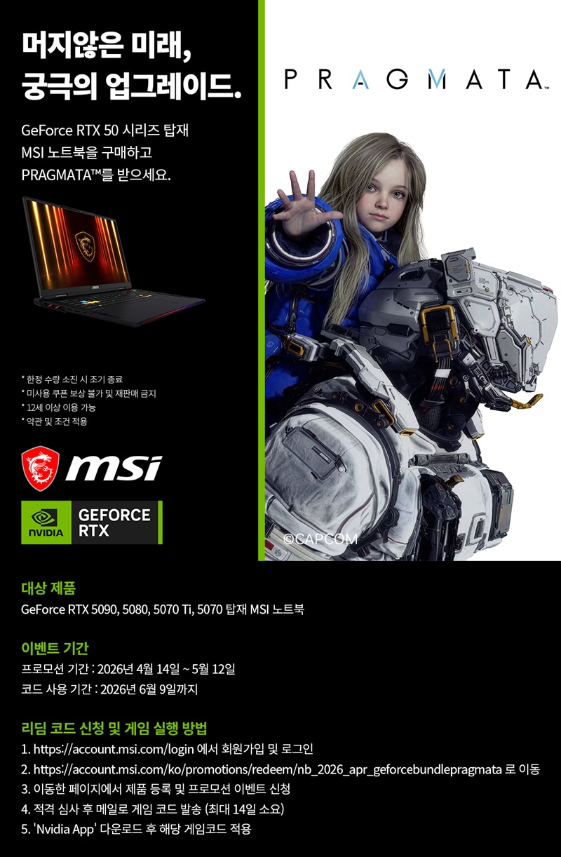 ㈜엠에스아이코리아(대표 공번서, https://kr.msi.com)는 NVIDIA GeForce RTX™ 50 시리즈 그래픽을 탑재한 MSI 노트북 구매 고객을 대상으로 캡콤의 신작 ‘프래그마타(PRAGMATA™)’ 게임 코드를 증정하는 프로모션을 진행한다고 밝혔다.