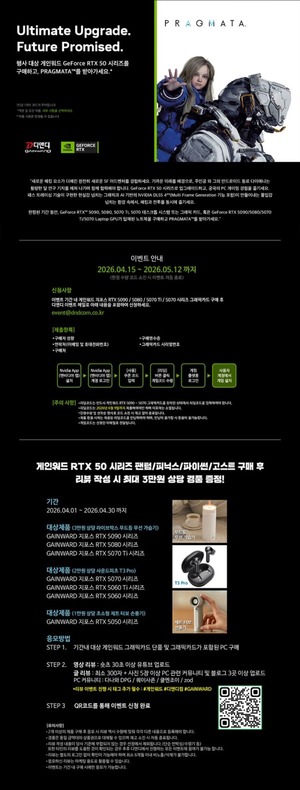 이번 프로모션 대상은 게인워드 지포스 RTX 5090, RTX 5080, RTX 5070 Ti, RTX 5070 시리즈 단품 그래픽카드 또는 해당 그래픽카드가 장착된 완제 PC 구매 고객이다. '프래그마타(PRAGMATA' 번들 프로모션 참여를 위해서는 이벤트 기간 내 대상 제품을 구입 후 디앤디컴 이벤트 메일(event@dndcom.co.kr)로 제품에 관한 정보 및 인적 사항을 등록하면 프로모션 진행 담당자가 확인 후, 고객에게 게임 코드를 이메일로 발송하며, 고객은 NVIDIA APP을 통해 리딤 코드를 등록하면 게임 등록 절차는 완료된다. 또한, 게임 코드는 1인당 1개만 제공되며, 한정 수량으로 준비된 게임 코드가 모두 소진될 경우 본 행사는 조기에 종료될 수 있음을 참고 바라며, 코드 인증 마감 시한인 2026년 6월 9일까지 리딤을 진행하지 않은 코드는 별도로 보상되지 않는다.