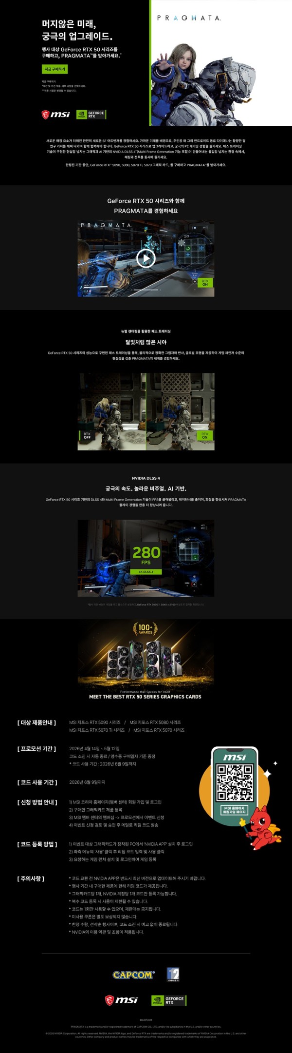 ㈜엠에스아이코리아(대표 공번서, https://kr.msi.com)는 MSI 지포스 RTX™ 50 시리즈 그래픽카드 구매 고객을 대상으로 ‘프래그마타(PRAGMATA)’ 게임 코드 증정 프로모션을 진행한다고 밝혔다.