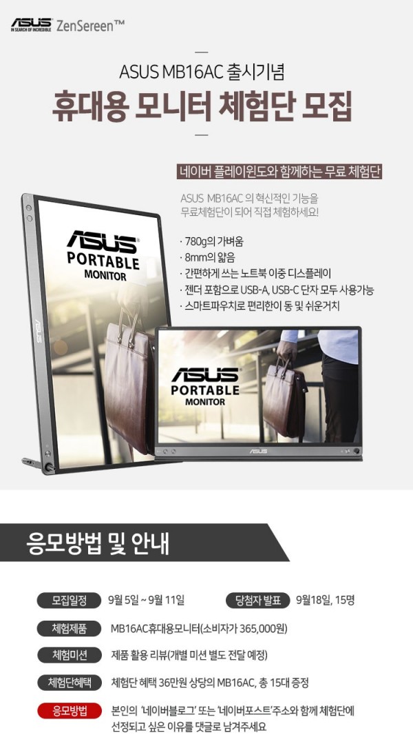 ASUS(이하 에이수스)가 네이버 플레이 윈도에서 휴대용 모니터 젠 스크린 MB16AC 모델 무료 체험 이벤트를 진행한다.