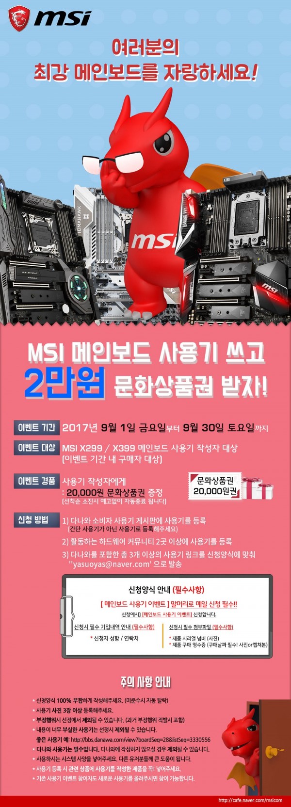 한편, MSI는 ‘MSI X399 게이밍 프로 카본 AC’ 구매 고객을 대상으로 푸짐한 경품을 증정하는 이벤트도 진행하고 있다. 9월 1일(금)부터 9월 30일(토)까지 기간 내 ‘MSI X399 게이밍 프로 카본 AC’ 제품 구매자를 대상으로 사용기를 작성하면 문화상품권 2만원권을 증정하는 사용기 이벤트를 진행한다. 이벤트에 대한 자세한 내용은 MSI 공식 카페 게시물(http://cafe.naver.com/msicom/7813)을 통해 확인 가능하다.