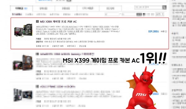 ㈜엠에스아이코리아(http://kr.msi.com, 대표 공번서)는 ‘MSI X399 게이밍 프로 카본 AC’가 가격비교 사이트에서 AMD 스레드리퍼를 지원하는 X399 칩셋 메인보드 인기 순위 1위에 올랐다고 밝혔다.