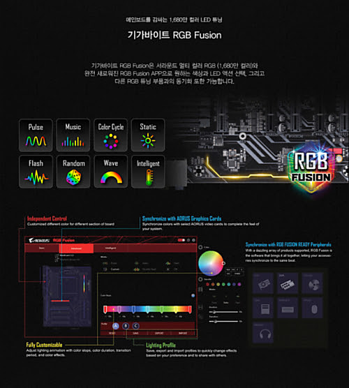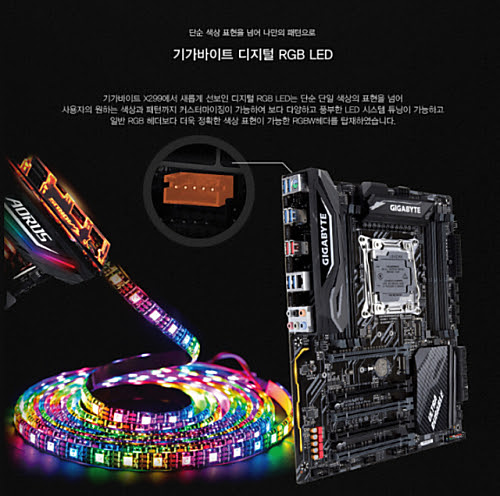 기가바이트 X299 시리즈에는 기가바이트의 LED 튜닝 기술인 RGB Fusion을 지원하며 1,680만 컬러를 기반으로 원하는 색상 설정 및 LED 액션 선택이 가능하고 X299 시리즈에서 최초로 디지털 RGB LED 기술을 채용하여 단순 단일 색상의 표현을 넘어 사용자가 원하는 색상과 패턴까지 커스터마이징 설정은 물론, RGBW 헤더를 추가 탑재하여 일반 RGB 헤더보다 정확한 색상 표현까지 가능하다.