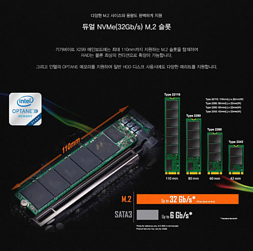 그리고 부품간의 공간 제약은 최소화 시키고 뛰어난 전송 속도 (최대 32Gb/s)를 지원하는 NVMe M.2 슬롯을 최대 3개까지 장착이 가능하여 RAID는 물론 하이앤드 시스템에서 필요한 대용량 초고속 스토리지의 조건을 만족시켰다.