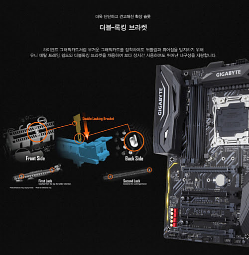 마지막으로 X299 UD4 PRO는 기가바이트의 듀러블 시리즈답게 더블-록킹 브라켓을 채용하여 하이앤드 그래픽카드를 장착하여도 뒤틀림과 휘어짐을 방지할 수 있도록 뛰어난 내구성을 가지도록 설계 되었다. 그리고 다양한 전기적 데미지를 사전에 예방하고자 디지털 퓨즈와 ESD, Surge 프로텍션까지 채용하여 듀러블 스탠다드를 만족 시켰다.