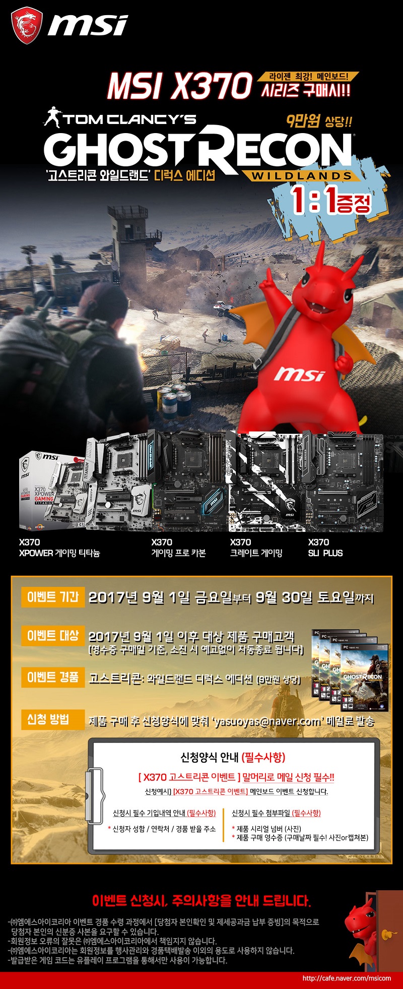 본 이벤트는 2017년 9월 1일(금)부터 9월 30일(토)까지 진행하며, MSI 메인보드 X370 모델(MSI X370 XPOWER 게이밍 티타늄, MSI X370 게이밍 프로 카본, MSI X370 크레이트 게이밍, MSI X370 SLI PLUS)을 구매한 고객을 대상으로 한다. 게임은 코드 형식으로 제공되며, 제품 구매 후 신청 양식(신청자 성함, 연락처, 제품 시리얼 넘버(S/N1) 캡쳐 또는 촬영본, 구매영수증[구매날짜 필수, 캡쳐 또는 촬영본])을 이벤트 메일(yasuoyas@naver.com)에 첨부하여 보내면 된다.