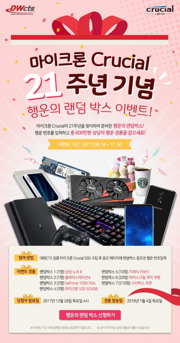 오는 9월 14일부터 오는 11월 30일까지 약 11주간 진행되는 이번 행사는 마이크론의 크루셜 브랜드 런칭 21주년을 기념하여 진행하는 행사로, 국내 공식 유통사인 대원 CTS 정품 SSD 구매자를 대상으로 마이크론 크루셜 1TB SSD를 시작으로 삼성 갤럭시 노트8, 소니 플레이스테이션4, 그래픽카드 및 기계식 키보드 등 총 1,000여만원 상당의 경품을 제공한다.