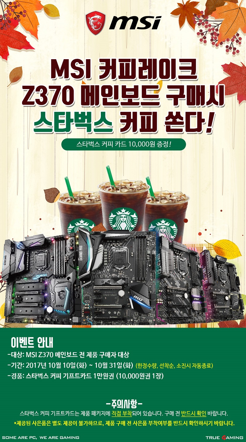 본 이벤트는 10월 10일(화)부터 10월 31일(화)까지 진행하며, MSI Z370 메인보드 전 제품을 대상으로 스타벅스 커피 기프트카드 1만원권을 증정한다. 해당 경품은 별도의 신청 없이 제품 패키지에 직접 부착되어 MSI Z370 구매 고객 누구나 선착순으로 증정 받을 수 있다. 단, 한정 수량으로만 진행돼 조기 마감이 예상된다.