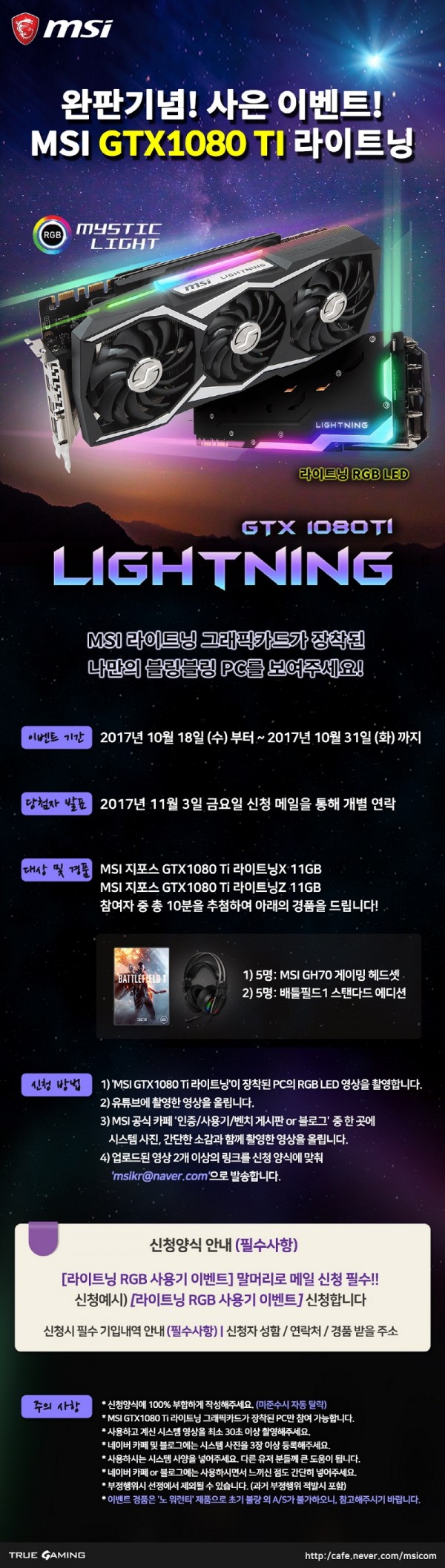 이벤트 기간은 2017년 10월 18일 수요일부터 10월 31일 화요일까지 진행되며 경품을 받기 위해서는 이벤트 기간 내에 ‘MSI 지포스 GTX1080Ti 라이트닝’ 그래픽카드의 특징인 RGB LED가 돋보이는 영상을 촬영하여 ‘유튜브’에 올리고 추가적으로 ‘MSI 공식 카페 인증/사용기/벤치 게시판’ 혹은 ‘네이버 블로그’ 중 한 곳에 등록, 총 2곳 이상에 등록하고 신청양식에 맞게 메일을 작성해 ‘msikr@naver.com’으로 발송하면 된다. 자세한 내용은 이벤트 페이지를 통해 확인할 수 있다. 당첨자 발표는 11월 3일 금요일 신청 메일을 통해 개별 연락될 예정이다.