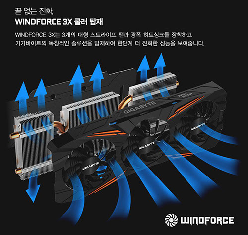 이 제품의 GPU코어 클럭은 게이밍 모드를 기준으로 기본 1607 MHz, 부스트 1683 MHz 를 기록하며, GDDR5 8GB (256bit)의 메모리와 함께 기가바이트 독자기술로 탑재된 직경 80mm 사이즈의 윈드포스 트리플팬과 광폭방열판, 2열 교차형 히트파이프 등을 갖춘 쿨링 시스템으로 혁신적인 냉각 효율을 달성했다.