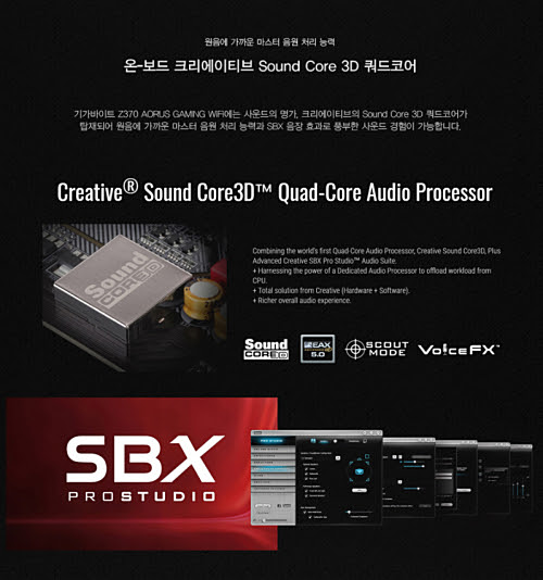 특히 Z370 AORUS GAMING WIFI 메인보드는 온-보드 크리에이티브 Sound Core 3D 쿼드코어를 탑재하여 원음에 가까운 마스터 음원 처리능력과 SBX 음장 효과로 풍부한 사운드 경험이 가능하며 후면 오디오를 금도금 처리하여 오염에 강력하고 전기적으로 발생할 수 있는 노이즈를 최소화 하였다.