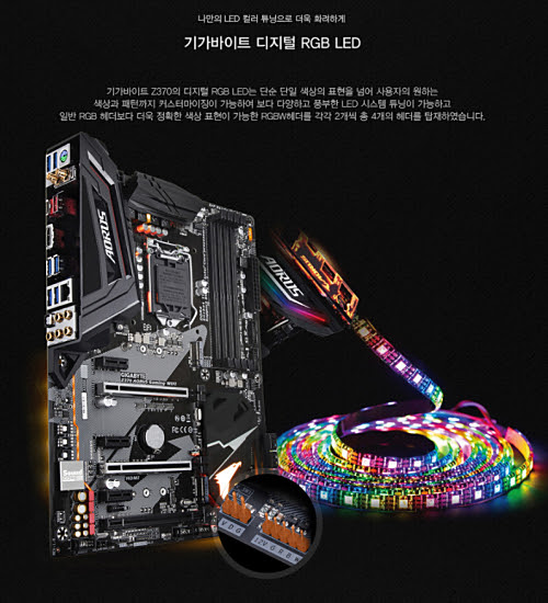그리고 기가바이트 Z370 메인보드에는 디지털 RGB LED 기술을 채용하여 단순 단일 색상의 표현을 넘어 사용자가 원하는 색상과 패턴까지 커스터마이징 설정까지 가능하다. 그리고 일반 RGB보다 더욱 정확한 색상이 표현이 가능한 RGBW 헤더까지 탑재하여 확장성과 튜닝의 화려함을 배가 시켰다.
