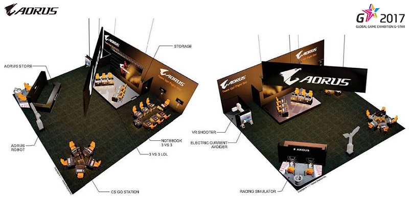 이번 행사에 선보이는 AORUS 부스는 그 동안 매년 대만 컴퓨텍스에서 선보여왔던 독창적이고 거대한 스케일을 부산 벡스코 전시장에 그대로 재현할 예정으로 데스크탑PC, 노트북PC 로 구동되는 E-SPORTS 게이밍존, 레이싱 게임 '프로젝트 카스2'를 가상현실 VR 장비와 함께 실제 드라이빙 중 온몸으로 느껴지는 중력을 그대로 전달하는 레이싱 시뮬레이터를 결합해 세계적인 기술력의 게이밍머신을 선보인다.