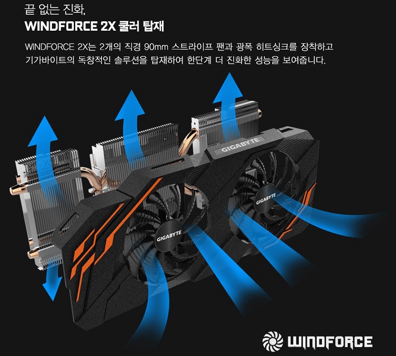 이 제품의 GPU코어 클럭은 게이밍 모드를 기준으로 기본 1607 MHz, 부스트 1683 MHz 를 기록하며, GDDR5 8GB (256bit)의 메모리와 함께 기가바이트 독자기술로 탑재된 직경 90mm 사이즈의 윈드포스 듀얼팬과 광폭방열판, 2열 교차형 히트파이프 등을 갖춘 쿨링 시스템으로 기가바이트 다운 혁신적인 냉각 효율을 달성했다.