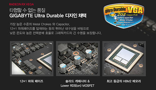 라데온 RX 베가 아키텍처의 심장을 품은 GIGABYTE 라데온 RX VEGA 64 Gaming은 대세로 주목받는 가상현실 (VR) 컨텐츠를 보다 여유롭고 부드럽게 재생하는 강력한 성능을 갖추고 있으며, 이렇게 안정적인 동작이 가능할 수 있도록 탄탄한 12+1 파워 페이즈(전원부), 2 OZ 구리PCB 기판, 최고 등급의 솔리드 캐패시터, METAL CHOKES, Lower RDS mosfet, HBM2 메모리 등을 탑재해 극한의 동작 환경에서도 뛰어난 내구성과 긴 수명을 보장한다.