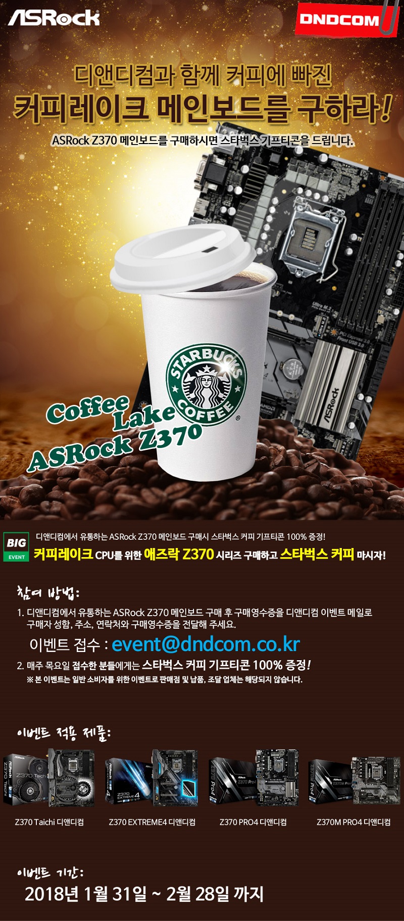 디앤디컴, dndcom, ASRock, 에즈락, 애즈락, 인텔, intel, 8세대 코어 프로세서, 커피레이크, Coffee Lake, Z370 시리즈 메인보드, 구매, 스타벅스 커피 기프티콘, 증정, 이벤트, 진행,