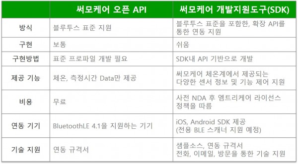 써모케어 스마트 체온계는 2017년 Bluetooth SIG의 인증을 받은 제품으로 관련 표준을 모두 지원하고 있다. 유헬스케어 게이트웨이 사업자 및 공공 서비스 개발 기업과 1년 이상의 연동 개발, 사업화를 통해 품질과 안정성이 확보된 상태에서 이번에 다양한 사업자가 자유롭게 헬스케어 서비스를 테스트하고 상용화할 수 있도록 오픈 API와 연동 규격을 공개하였다.