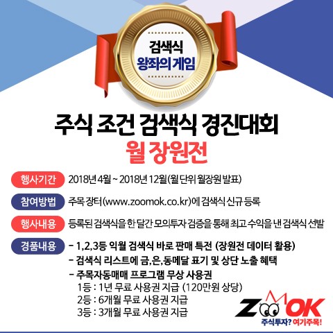 소프트웨어 개발 전문 회사 (주)한맥소프트웨어(대표 권순모)가 주식 조건검색식을 매매할 수 있는 장터 ‘주목’(ZoomOK) 오픈 기념으로 다양한 경품을 걸고 진정한 ‘검색식의 강자를 가리는 월 단위 릴레이 이벤트’를 진행한다고 16일 밝혔다.